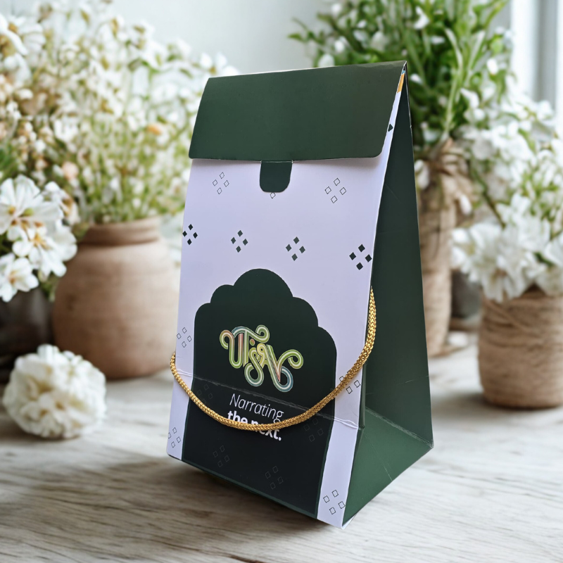 Elegant custom-designed paper bags with a premium flap closure and gold rope handle, perfect for luxury brands, boutiques, gifting, weddings, and festive packaging. Designed to elevate brand value with a rich, classy finish.