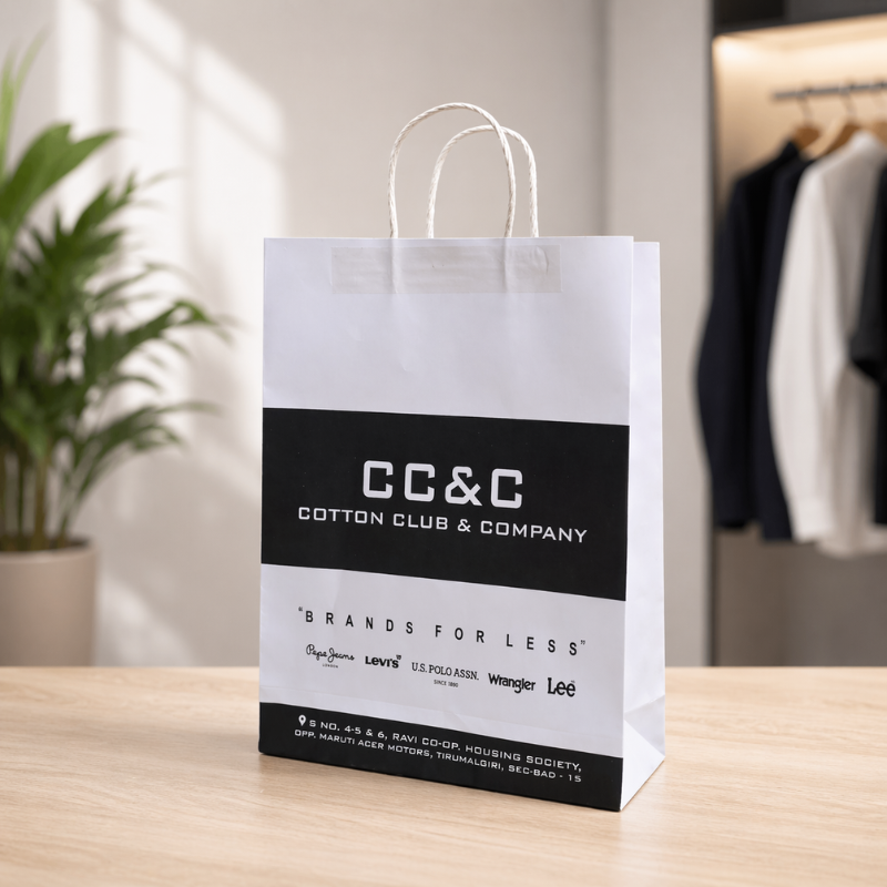Enhance your retail brand with our premium paper carry bags designed for men’s fashion stores. Ideal for packaging shirts, jeans, accessories, and apparel, these bags offer a perfect combination of durability and modern style. Crafted from high-quality paper material with a clean and minimal design, this bag reflects a professional retail image. The strong twisted paper handles ensure easy carrying, making it perfect for everyday store use. At Arrow Paper Products, we specialize in custom printed retail bags that help clothing brands create a lasting impression with every purchase.