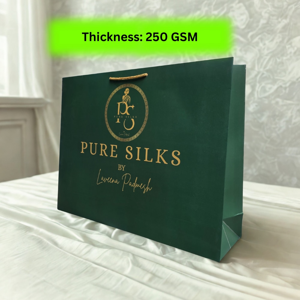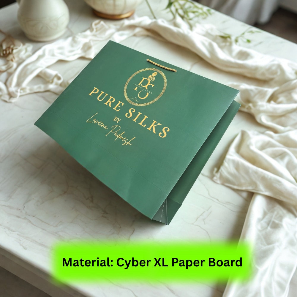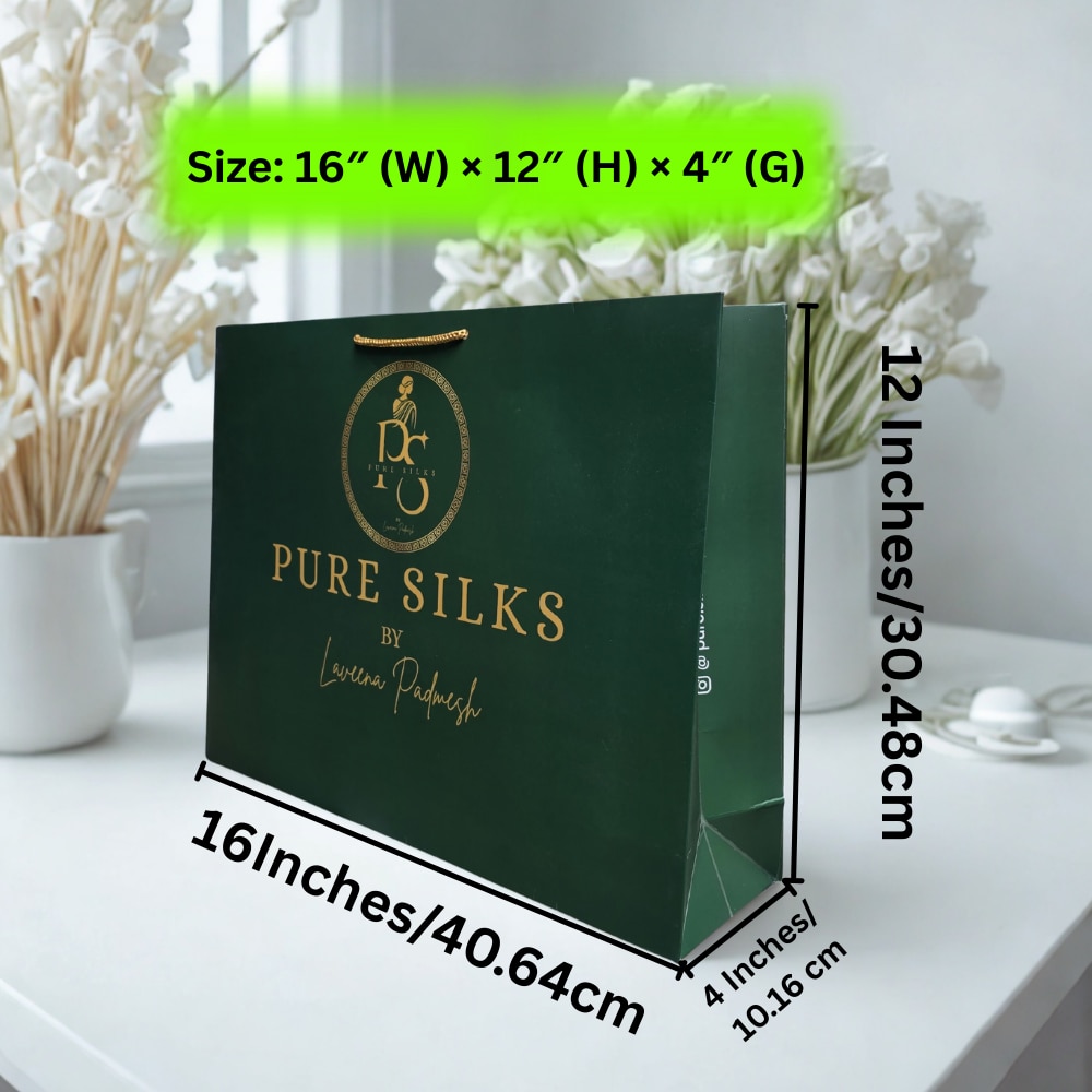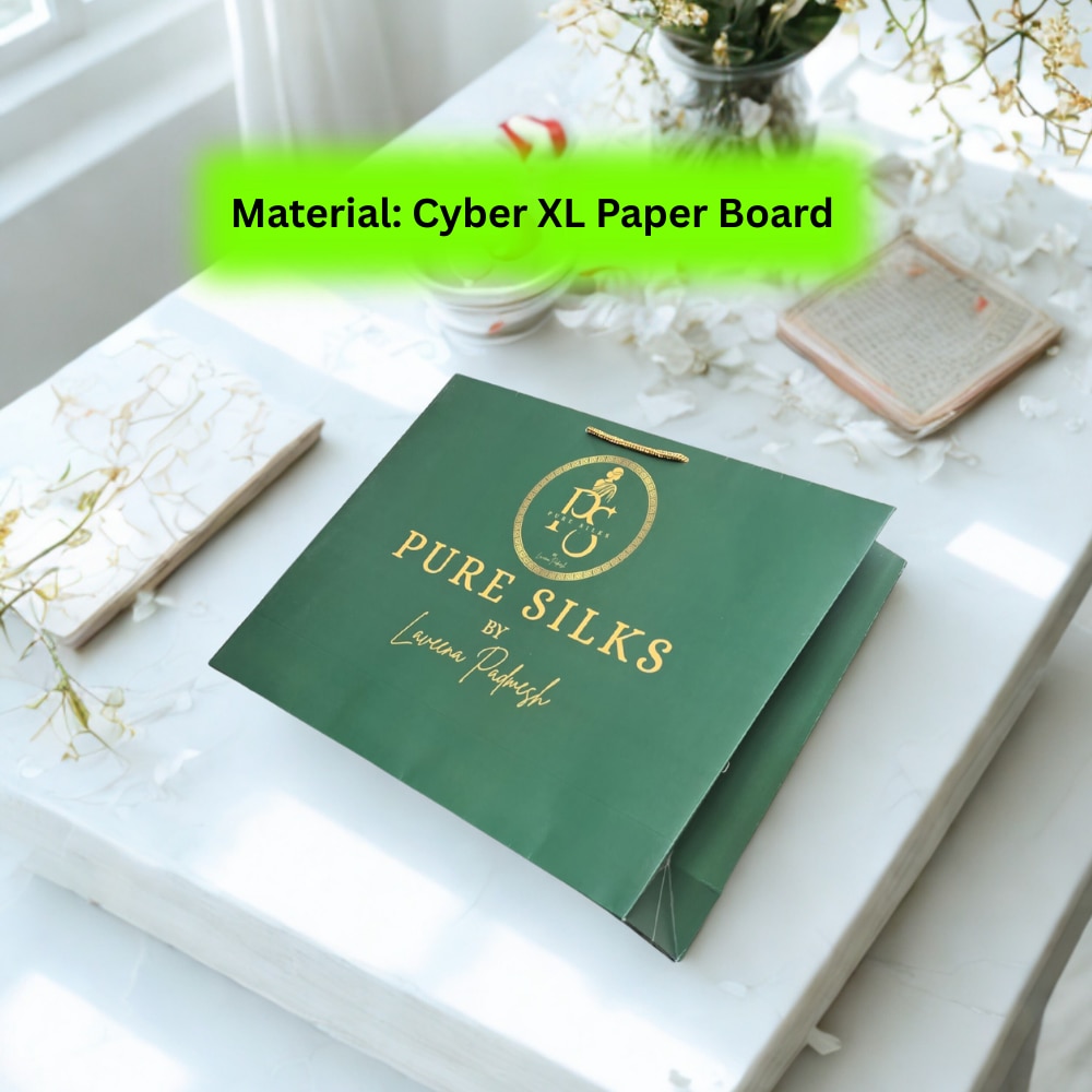 This premium paper carry bag is manufactured using 250 GSM Cyber XL paper board, designed for strength, durability, and superior print quality. With a size of 16 inches width × 12 inches height × 4 inches gusset, it is ideal for saree showrooms, boutiques, garment stores, and luxury retail packaging. The bag features multicolour offset printing with matte lamination finish, providing a smooth texture and elegant non-glossy appearance. Matte lamination protects the surface from scratches and enhances the overall premium feel. Its strong structure and reinforced gusset make it suitable for carrying garments, silk sarees, fashion products, and premium gift items safely. Manufactured by Arrow Products with complete customization options.