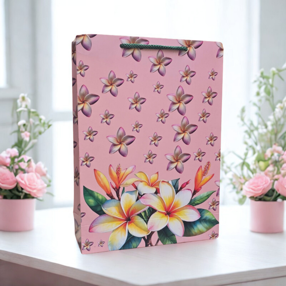 This elegant floral theme paper carry bag features a beautiful Champa (Plumeria) flower design, making it perfect for boutique stores, gift packaging, wedding return gifts, festive hampers, and premium retail branding. Manufactured using high-quality durable paper with a strong rope handle, this bag offers both style and strength. The attractive floral print adds a luxury and sophisticated touch to your packaging, enhancing brand presentation and customer experience. Ideal for saree shops, cosmetic stores, gift shops, jewelry packaging, and event return gifts. Custom size, logo printing, and bulk order options are available from Arrow Paper Products.