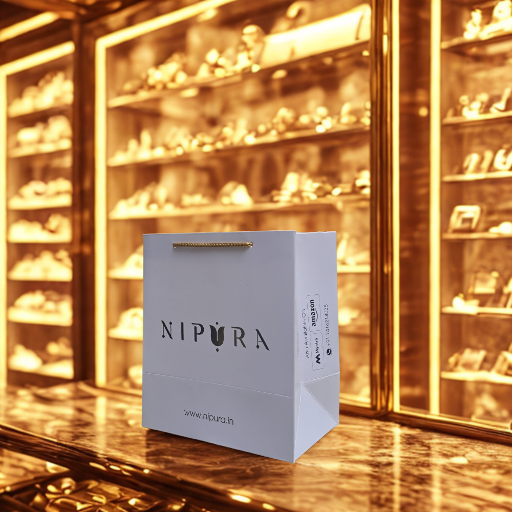 This premium luxury paper carry bag is specially designed for jewellery stores and high-end boutiques. Made from strong paper board with a smooth finish, the bag features elegant gold foiling that enhances brand visibility and gives a rich, premium look. The ribbon handle adds both style and comfort, making it perfect for carrying delicate and valuable items like diamond jewellery, silver ornaments, polki sets, and gift boxes. Ideal for jewellery showrooms, wedding collections, festive gifting, and premium retail packaging, this bag reflects sophistication and enhances the overall customer experience.