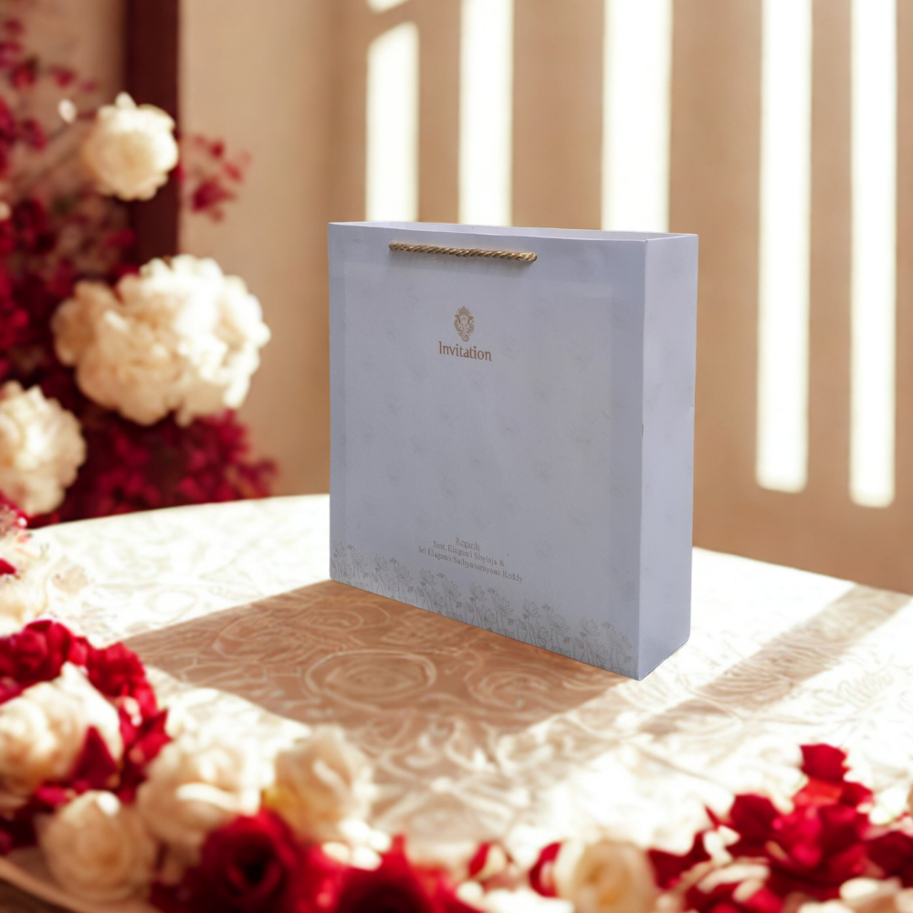 This premium paper carry bag is specially designed for wedding invitation packaging. It is used to pack and present wedding invitation cards, gift boxes, sweets, and return gifts in an elegant and organized way. The strong paper board and rope handle make the bag durable and easy to carry, while the premium design adds a luxury look to wedding invitations. These bags can also be customized with family names, wedding monograms, or invitation branding, making them perfect for special occasions. Ideal for weddings, engagements, receptions, and family celebrations.