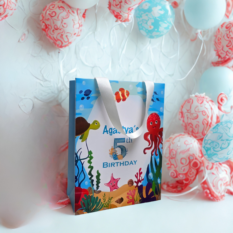 This customized birthday theme paper carry bag is specially designed for kids’ birthday celebrations and party return gifts. Made from high-quality paper material, the bag features a colorful underwater cartoon theme with premium printing that makes it attractive and fun for children.