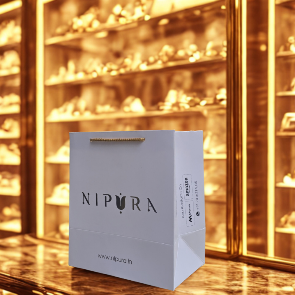 Premium custom printed jewellery paper bags with gold foil branding, specially designed for jewellery showrooms and luxury retail stores. The elegant gold foiling enhances the brand logo and gives a rich, premium look suitable for high-end products.