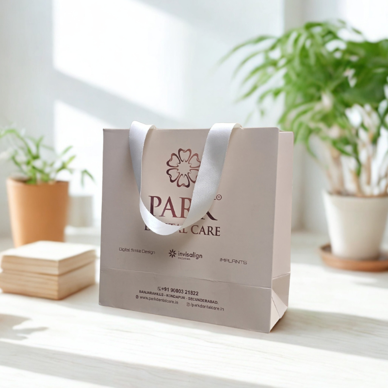 This luxury paper carry bag is manufactured using high-quality premium paper board, designed for professional branding and elegant packaging. It is ideal for clinics like Park Dental Care, corporate businesses, boutiques, and retail stores.